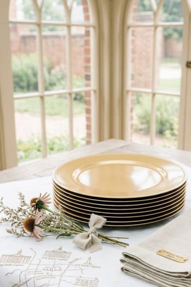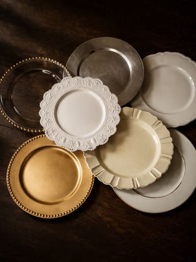 A staple of formal table settings, our charger plates provide an elegant base for event table styling. Used beneath the dinner plate, they anchor layered place settings and remain on the table throughout the meal, adding a refined finish to weddings, tea parties, and special events.